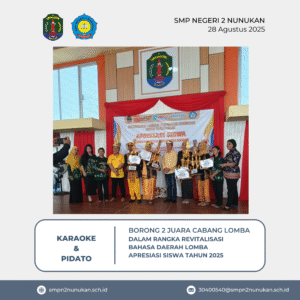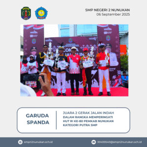 Tim futsal SMP Negeri 2 Nunukan (SPANDANU) kembali menorehkan prestasi membanggakan dengan meraih juara pada ajang Gala Turnamen HSM Futsal. Keberhasilan ini menambah deretan prestasi olahraga futsal yang telah diraih SPANDANU sebelumnya, sekaligus menjadi bukti nyata kerja keras siswa dan pembina dalam mengembangkan bakat serta sportivitas di bidang olahraga.
