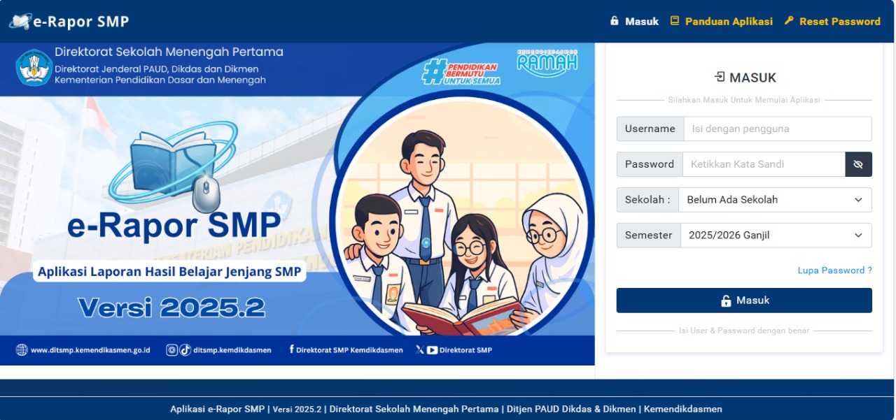 Kami informasikan bahwa e-Rapor versi 2025.2 yang dirilis oleh Direktorat Sekolah Menengah Pertama, Kementerian Pendidikan Dasar dan Menengah telah tersedia dan dapat digunakan oleh seluruh guru mata pelajaran.
