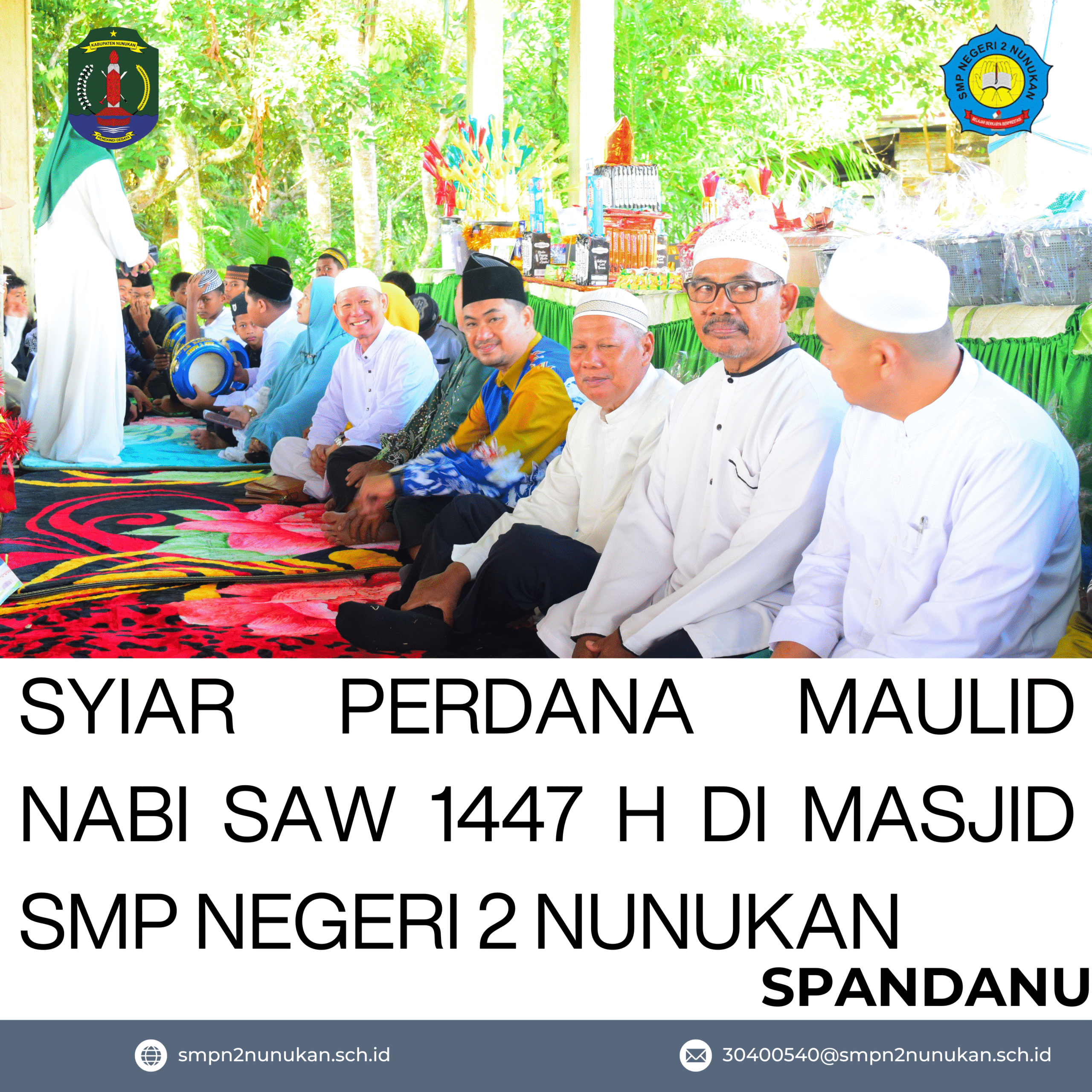 SMP Negeri 2 Nunukan (SPANDANU) untuk pertama kalinya menyelenggarakan peringatan Maulid Nabi Muhammad SAW 1447 H di Masjid sekolah pada hari ini Kamis, 25 September 2025. Acara berlangsung penuh khidmat dengan dihadiri oleh guru, tenaga kependidikan, siswa, serta tokoh masyarakat setempat.